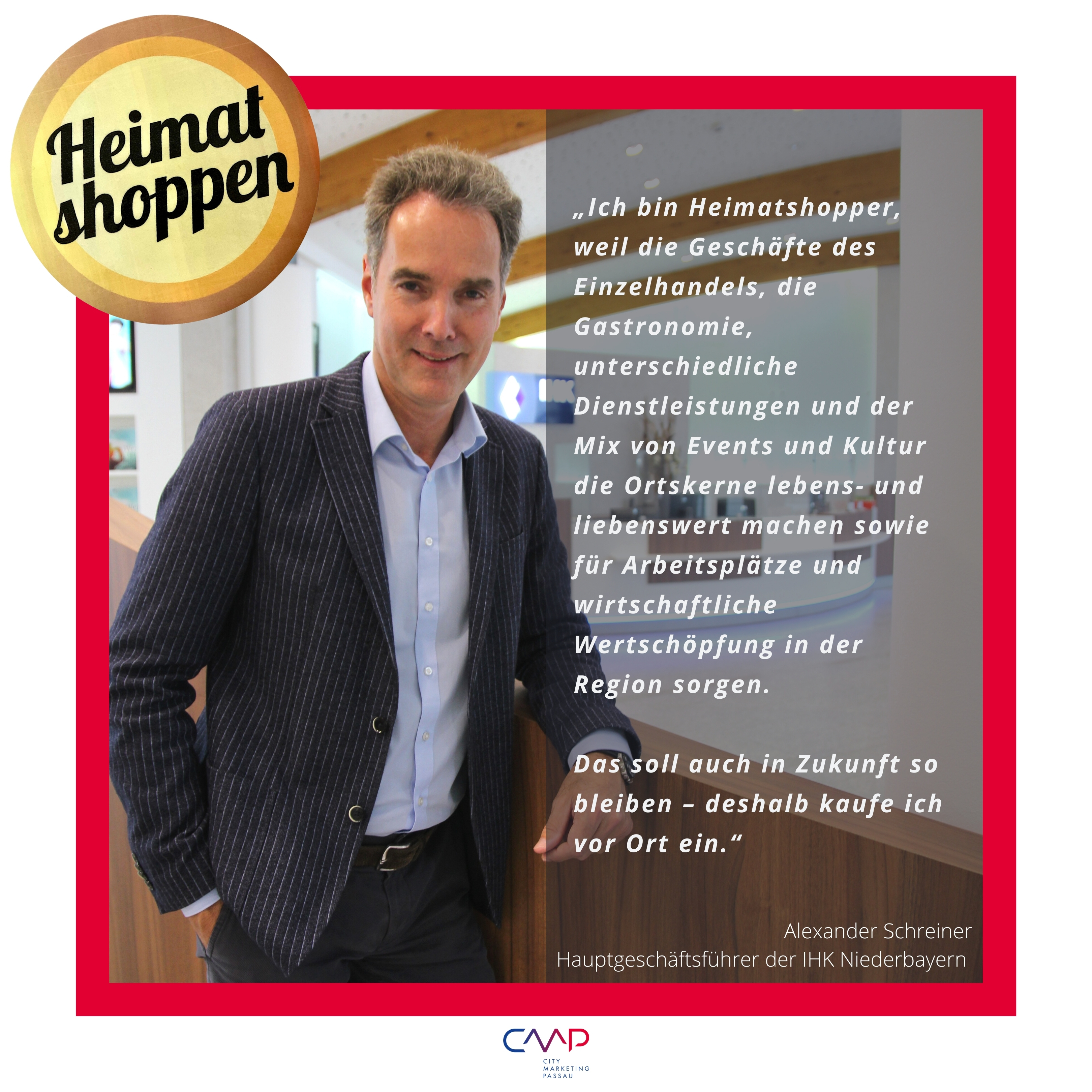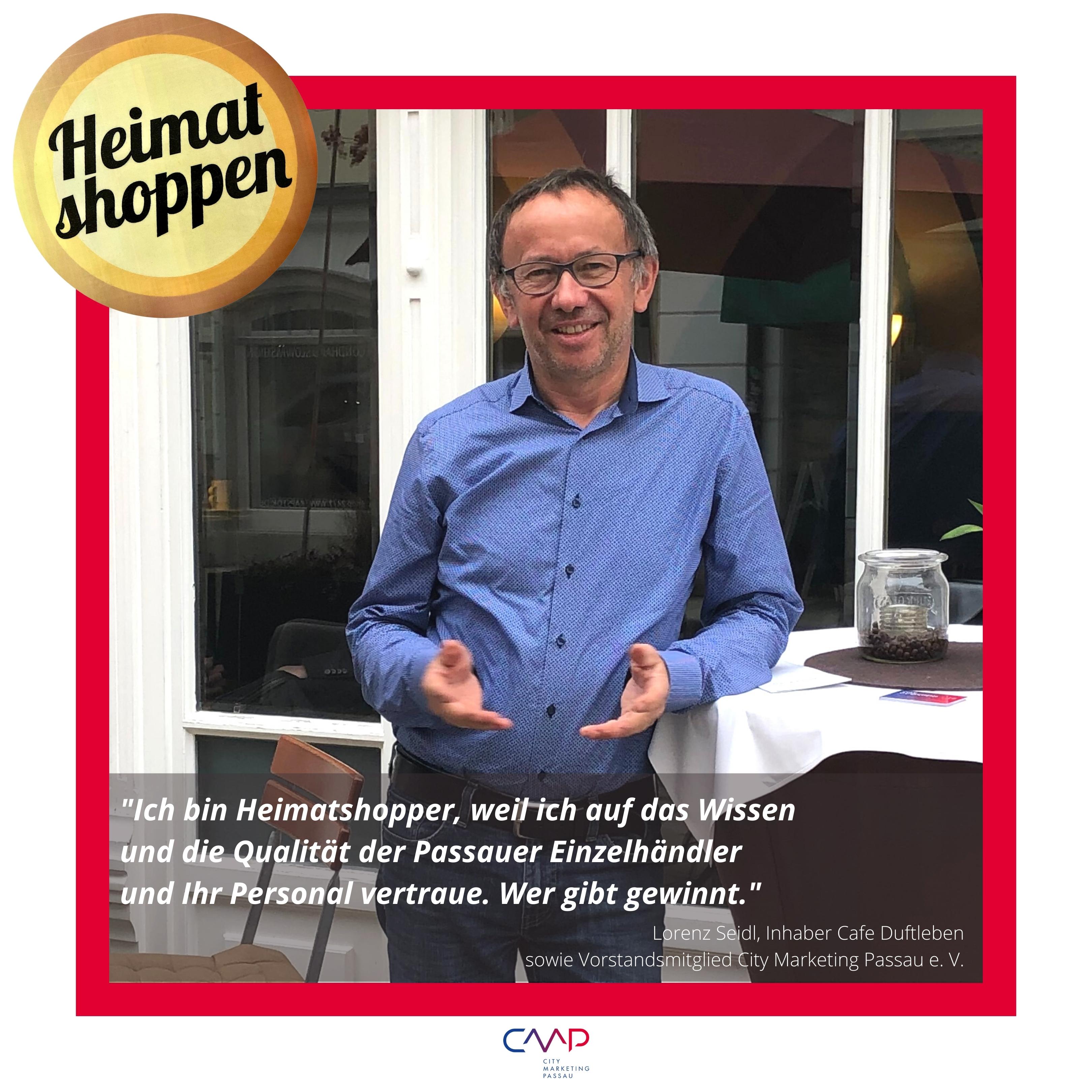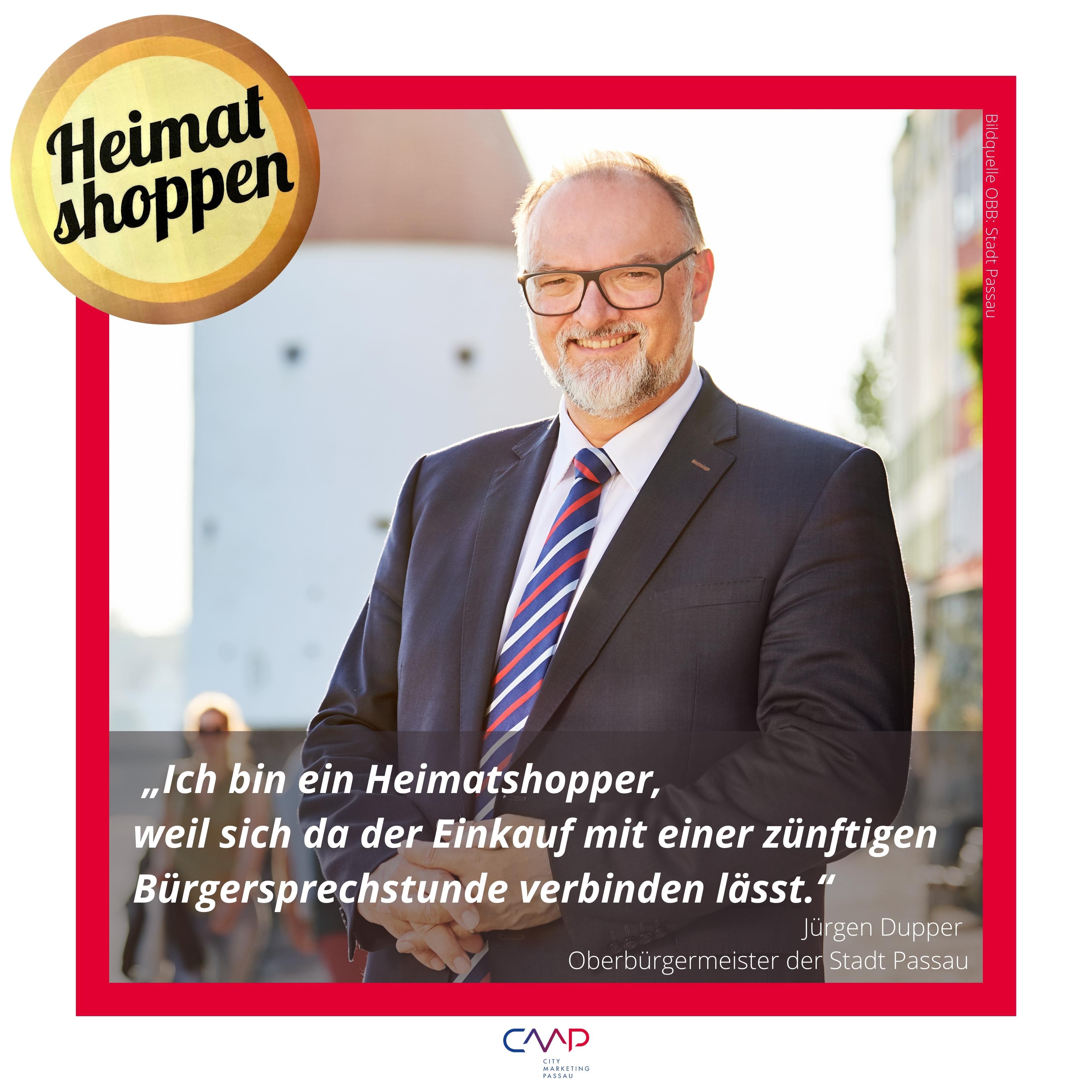 Die City Marketing Passau e. V. unterstützt die Initiative "Heimat shoppen" der IHK Niederbayern. Diese Initiative betont die Wichtigkeit des lokalen Einzelhandels, der im Zusammenspiel mit Gastronomie und Dienstleistungsbereich die Basis für eine lebendige, lebens- und liebenswerte Innenstadt bildet.