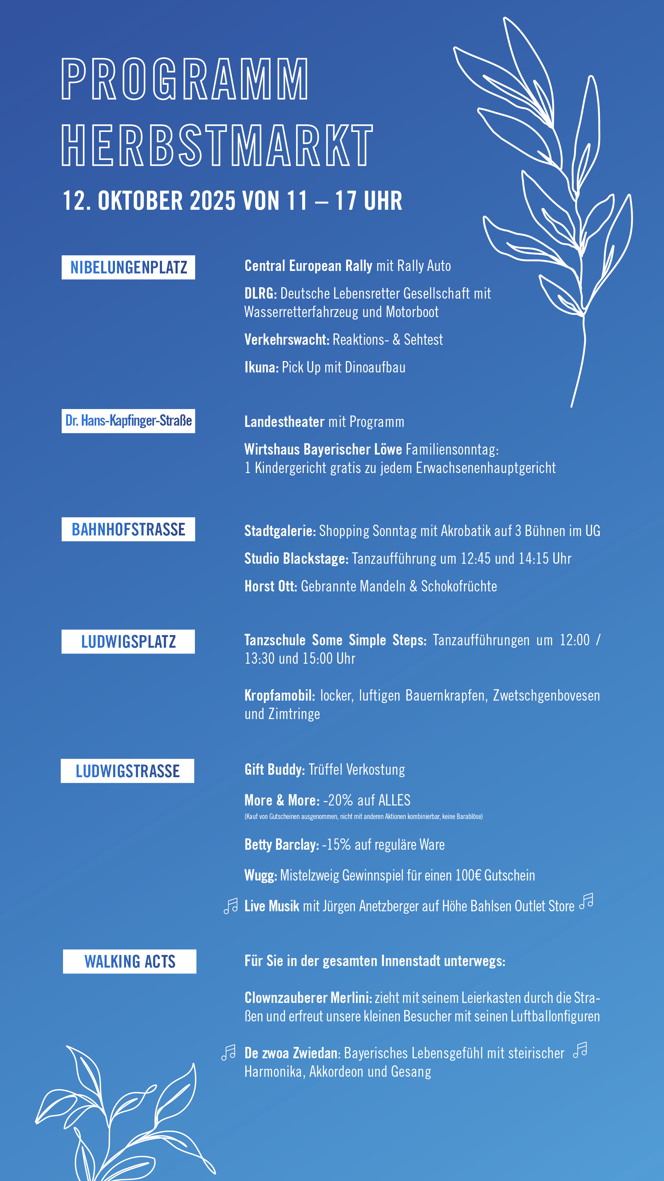 Die Stadtgärtnerei sorgt mit zusätzlichen Pflanzen und aufwendigen Arrangements für optische Highlights in der Fußgängerzone. Verführerisch duftende Schmankerlstände auf dem Herbstmarkt und die große Auswahl an Lokalen und Cafés bieten für jeden Geschmack genau das Richtige. City Marketing Passau e.V., die Passauer Händlerschaft, die teilnehmenden Vereine sowie die Marktstandbetreiber, Fieranten und Musiker des Herbstmarktes freuen sich auf zahlreiche Besucherinnen und Besucher.